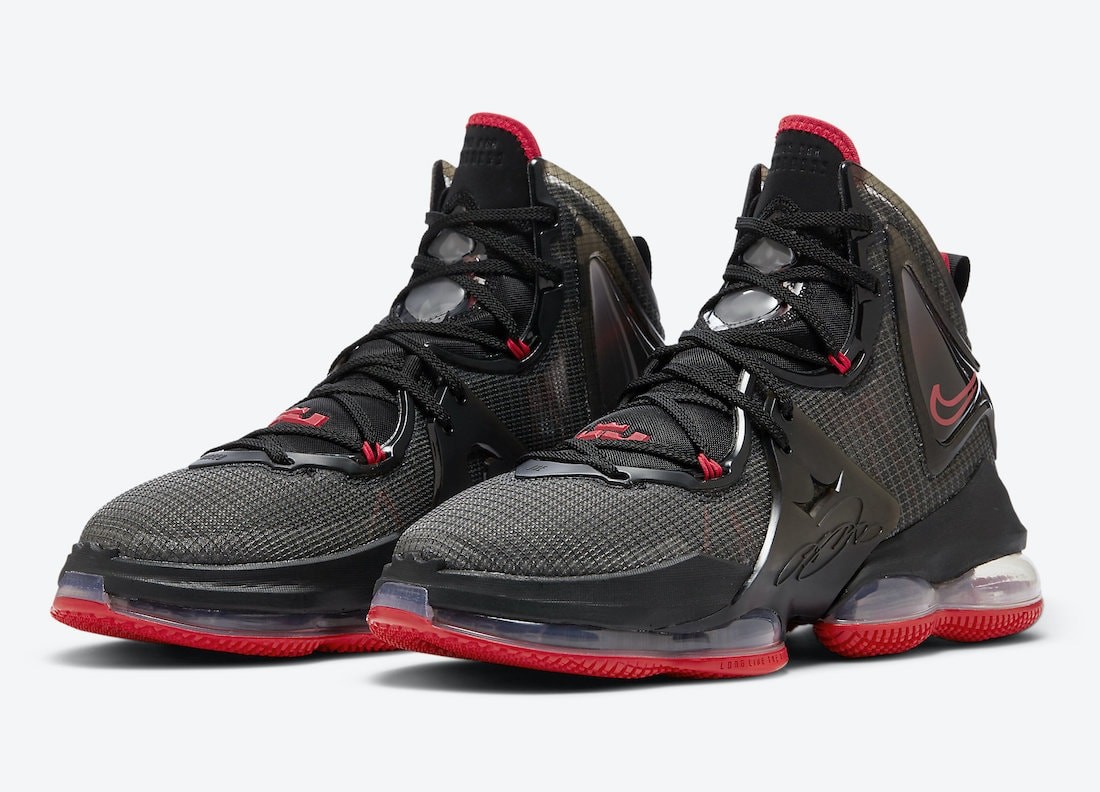 LeBron 19 в классической расцветке «Bred» получили сетчатый верх с пластиковыми накладками. Серая дышащая основа комбинируется с мягким язычком с небольшими воздушными блоками. Подошва, окантовка язычка, изображение короны, петли на шнуровке, «свуши» по бокам выполнены в красном цвете. В межподошве для амортизации виден прозрачный Zoom Air в передней части стопы и двойной модуль Air Max под пяткой.