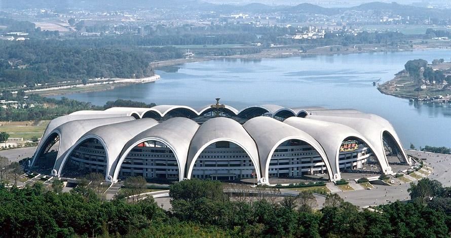 Этот гигантский красавец — крупнейшая арена в Азии и вообще в мире. Здесь принимает гостей сборная Северной Кореи по футболу. Немало зрителей собирает грандиозный праздник «Ариран» и другие массовые развлекательные мероприятия.