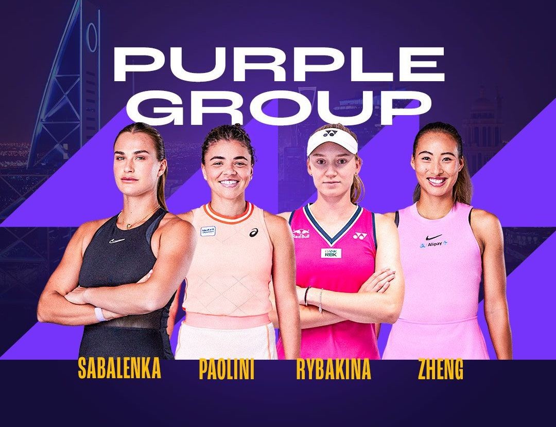 В Фиолетовой группе сыграют первая ракетка мира Арина Соболенко, олимпийская чемпионка Чжэн Циньвэнь, чемпионка Уимблдона-2022 Елена Рыбакина и дебютантка турнира Жасмин Паолини.